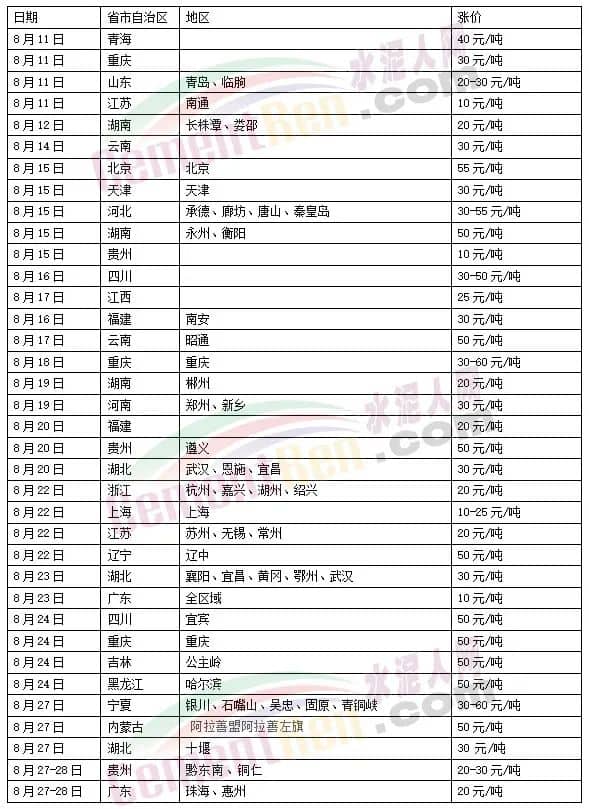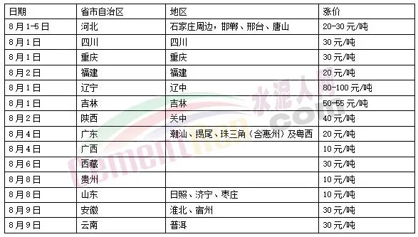 據(jù)水泥人網(wǎng)不完全統(tǒng)計(jì)7月中旬至8月初江蘇、浙江、上海、安徽、河南、山東、河北、福建、遼寧、吉林、陜西、重慶、四川、貴州、廣西等20多個(gè)區(qū)域水泥價(jià)格通知上調(diào)。進(jìn)入8月中旬,發(fā)布漲價(jià)函的區(qū)域進(jìn)一步擴(kuò)大至青海、寧夏、內(nèi)蒙、黑龍江、湖北、北京、天津等30多個(gè)區(qū)域。