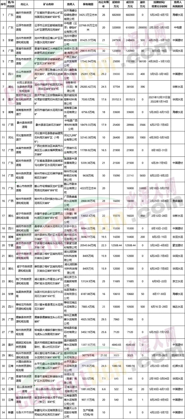 據(jù)水泥人網(wǎng)不完全統(tǒng)計(jì),從近一年來公示公告的34宗采礦權(quán)掛牌出讓結(jié)果可見中國建材、海螺水泥、華潤水泥、華新水泥、紅獅水泥、臺(tái)泥水泥、豪龍建材、京蘭水泥等均有競(jìng)得采礦權(quán)。其中,中國建材競(jìng)得8宗采礦權(quán),華潤水泥競(jìng)得5宗,海螺水泥、華新水泥各競(jìng)得2宗采礦權(quán),其他企業(yè)僅競(jìng)得1宗采礦權(quán)。