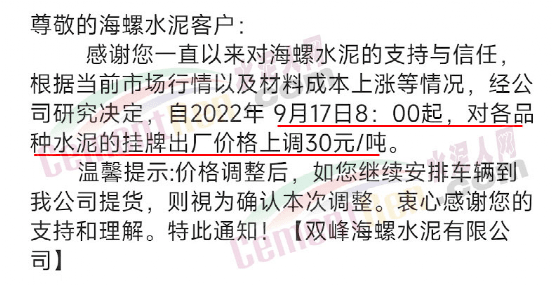雙峰海螺水泥有限公司通知,根據(jù)當(dāng)前市場行情以及材料成本上漲等情況,經(jīng)公司研究決定,自2022年9月17日800起,對各品種水泥的掛牌出廠價格上調(diào)30元/噸。