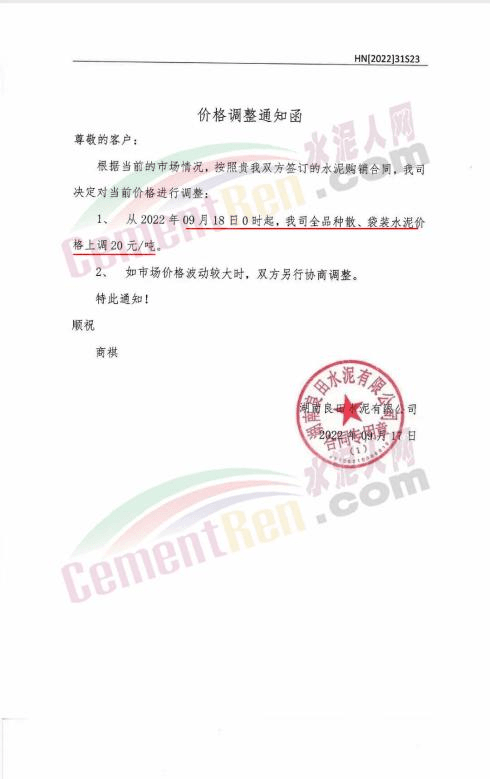 華潤水泥旗下湖南良田水泥有限公司通知,9月18日0時起,公司全品種散裝、袋裝水泥價格上調(diào)20元/噸。