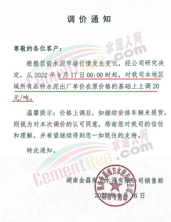 湖南金磊南方水泥有限公司銷售部通知,自9月17日0時起,對公司本地區(qū)域所有品種水泥出廠價上調(diào)20元/噸。