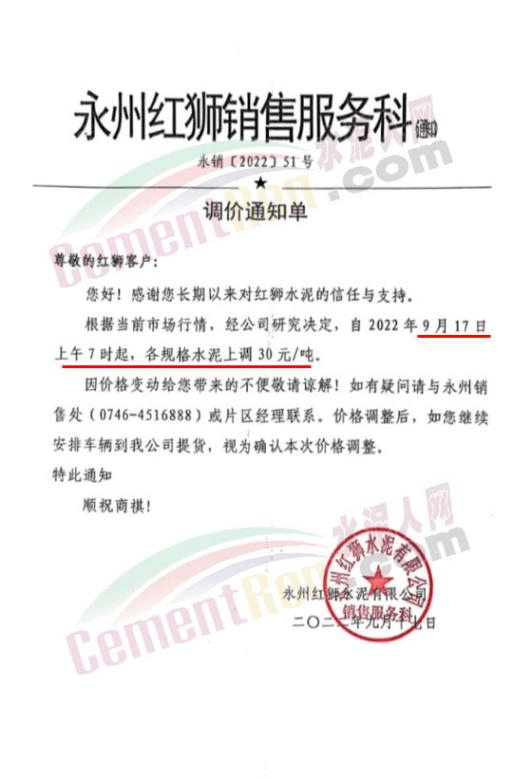 永州紅獅水泥有限公司通知,自9月17日上午7時起,各規(guī)格水泥上調(diào)30元/噸。