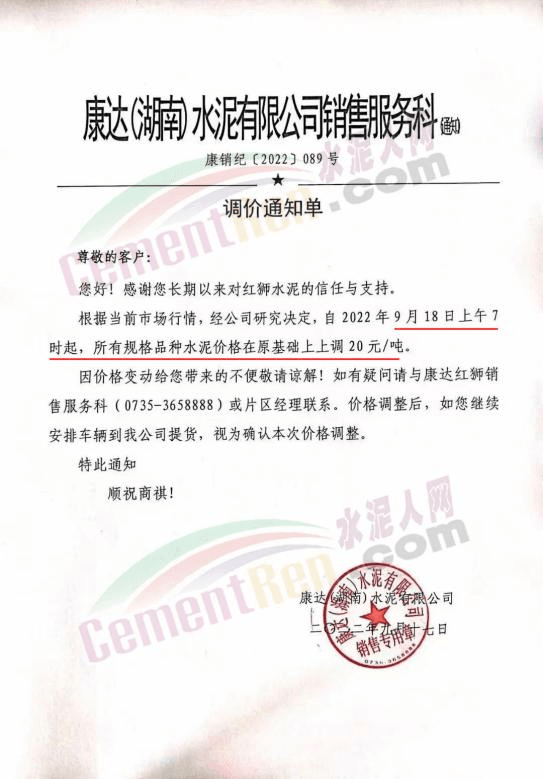 紅獅水泥旗下康達(dá)(湖南)水泥有限公司銷售服務(wù)科通知自9月18日上午7時起,所有規(guī)格品種水泥價格在原基礎(chǔ)上上調(diào)20元/噸。