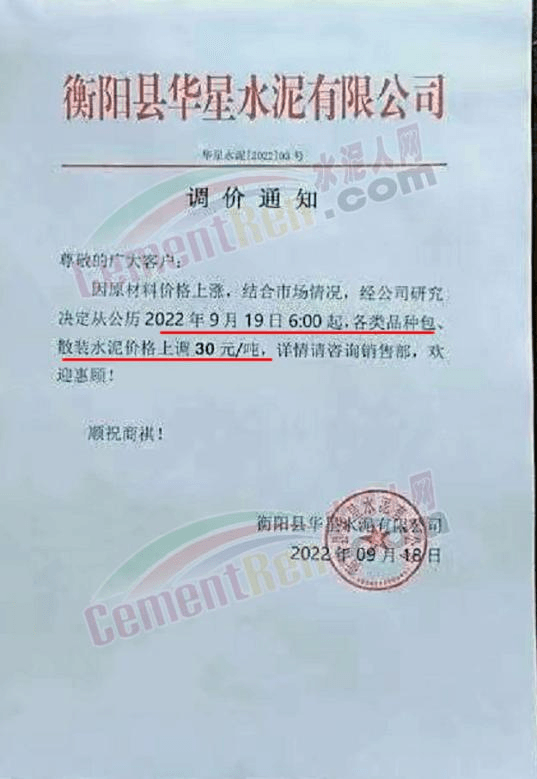 湖南衡陽縣華星水泥有限公司通知,自9月19日6時起,各類品種包散裝水泥價格上調(diào)30元/噸。