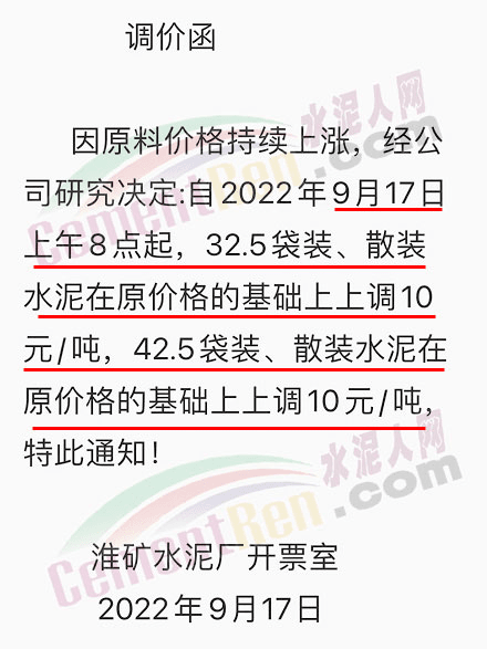 淮南市禹山水泥有限公司通知因原料價格持續(xù)上漲,經(jīng)公司研究決定∶自9月17日上午8點起,32.5袋裝、散裝水泥在原價格的基礎(chǔ)上上調(diào)10 元/噸,42.5袋裝、散裝水泥在原價格的基礎(chǔ)上上調(diào)10元/噸。