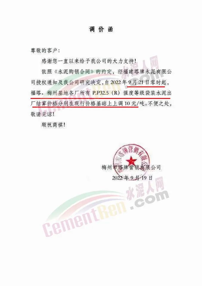 梅州市塔牌營銷有限公司通知,經(jīng)福建塔牌水泥有限公司授權(quán)通知及公司研究決定,自9月21日零時起,福塔、梅州基地各廠所有P.P32.5(R)強(qiáng)度等級袋裝水泥出廠結(jié)算價格分別在現(xiàn)行價格基礎(chǔ)上上調(diào)10元/噸。