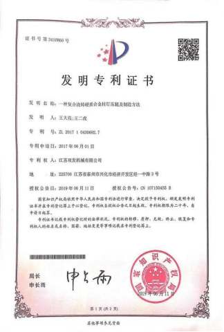 鑄釘合金輥套發明專利證書: