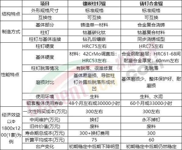 鑲嵌式柱釘輥與鑄釘輥數據對比: