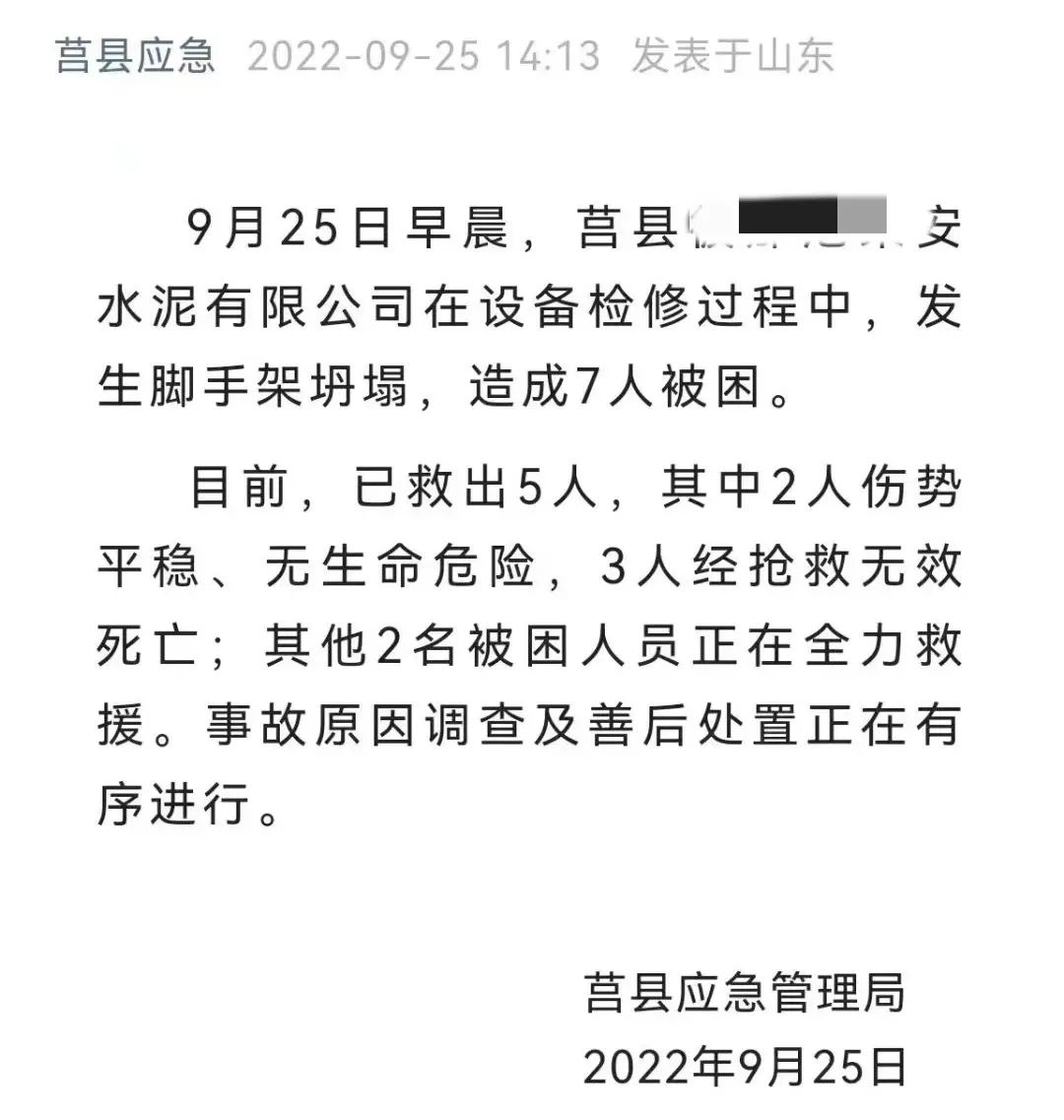 9月25日,莒縣應急官微發布消息,莒縣某安水泥有限公司在設備檢修過程中,發生腳手架坍塌,造成7人被困。