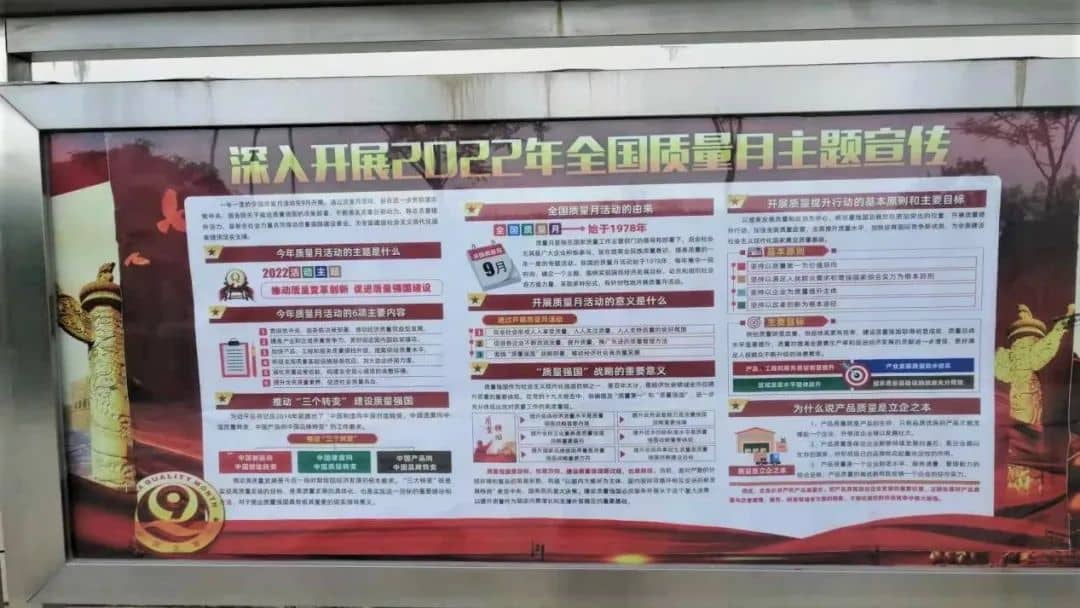 為加大“質(zhì)量月”的宣傳力度,營造濃厚的質(zhì)量月氛圍,區(qū)域所屬各公司充分利用電子屏、宣傳欄、宣傳海報(bào)等形式,在廠區(qū)重點(diǎn)區(qū)域懸掛橫幅,利用顯示屏循環(huán)播放質(zhì)量活動(dòng)月相關(guān)宣傳視頻,生產(chǎn)現(xiàn)場設(shè)立宣傳展板,向職工發(fā)放宣傳資料,不斷加大宣傳力度,營造人人知曉的宣傳氛圍,全方位對(duì)職工進(jìn)行覆蓋式質(zhì)量意識(shí)教育,為公司高質(zhì)量發(fā)展夯實(shí)基礎(chǔ)。