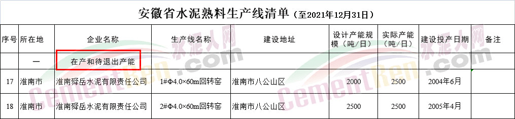 安徽省經信廳此前公布的截至2021年底的水泥熟料生產線清單可見,淮南舜岳水泥有限責任公司兩條2500t/d熟料生產線建成投產時間分別為2004年和2005年。