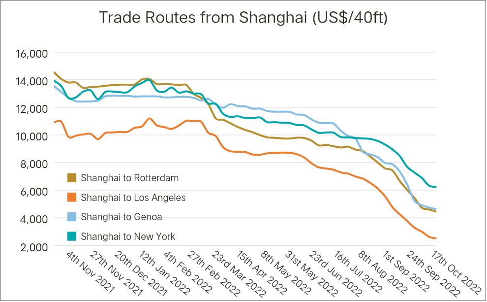 國(guó)際航運(yùn)市場(chǎng),從去年的一船難求到如今的無人問津可見一斑,近日,上海至洛杉磯集裝箱指數(shù)正在斷崖式下跌;上海發(fā)往歐洲路特丹港的集裝箱指數(shù)也在急劇下跌;上海發(fā)往意大利熱那亞的集裝箱指數(shù)也難以幸免。這三個(gè)數(shù)據(jù)很明確的說明中國(guó)在太平洋、印度洋和大西洋的航運(yùn)指數(shù)正在急劇下降。