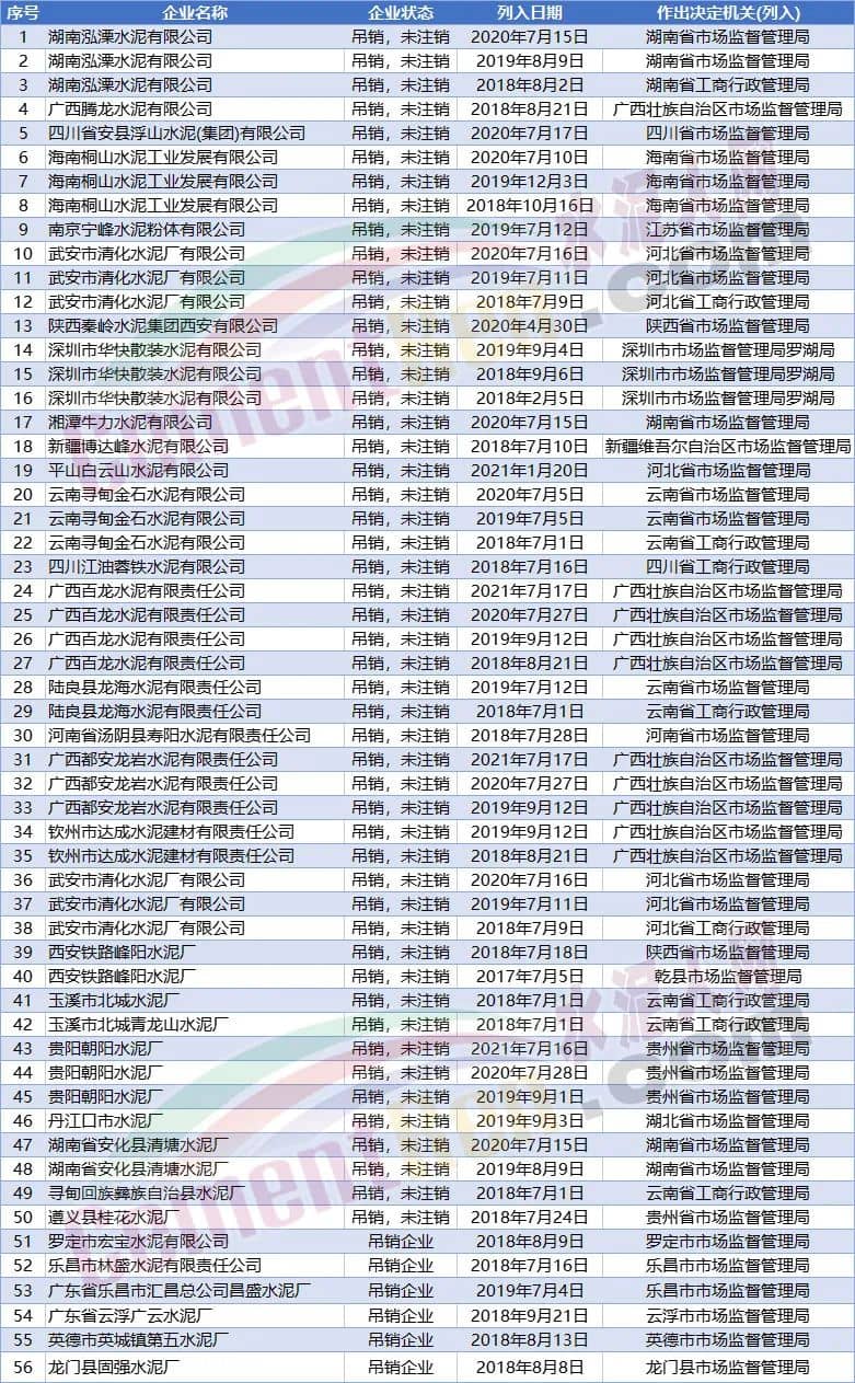 據(jù)了解,吊銷未注銷是指公司營業(yè)執(zhí)照被吊銷,該公司的主體資格依然存在,但經(jīng)營資格已經(jīng)取消。同時,有的省份工商局還將被吊銷企業(yè)法人列入黑名單,三年內(nèi)在全國都不能辦理個體營業(yè)執(zhí)照,公司不能擔(dān)任董事、監(jiān)事、經(jīng)理。公司注銷是指當(dāng)一個公司宣告破產(chǎn),被其他公司收購、規(guī)定的營業(yè)期限屆滿不續(xù)、或公司內(nèi)部解散等情形時,公司需要到登記機關(guān)申請注銷,以終止公司法人資格的過程。也就是說僅僅不到五年時間這33家水泥企業(yè)已經(jīng)不復(fù)存在了。