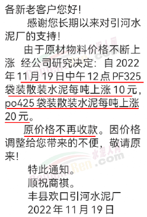 豐縣歡口引河水泥廠通知,由于原材物料價格不斷上漲,經公司研究決定自2022 年11月19日中午12點P.F325 袋裝散裝水泥每噸上漲10元,PO425袋裝散裝水泥每噸上漲20元,原價格不再收款。