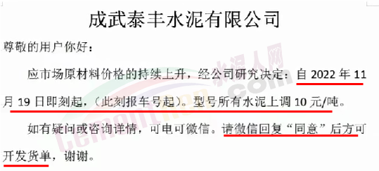 成武泰豐水泥有限公司通知,應市場原材料價格的持續上升,經公司研究決定自2022年11 月19日即刻起所有水泥上調10元/噸。微信回復“同意”后方可開發貨單。