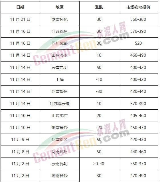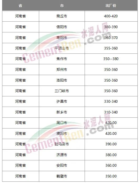 水泥人網信息中心重點監控的河南省30多家企業報價顯示,截至11月21日,區域內各企業出廠報價在310-420元/噸。