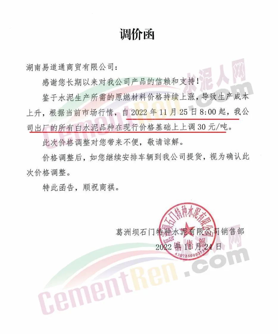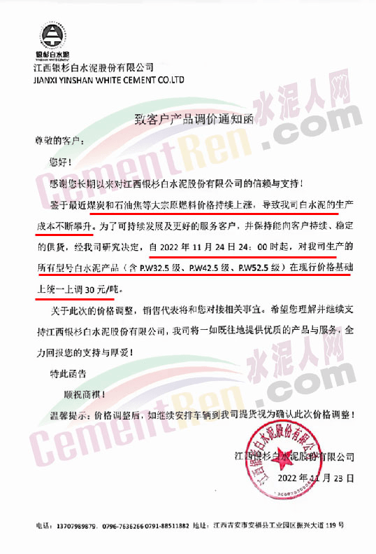 阿爾博波特蘭(安慶)有限公司通知,鑒于近期原燃材料成本上漲,導(dǎo)致生產(chǎn)成本大幅上升經(jīng)公司研究決定,自11月24日0時(shí)起,湖南區(qū)域在現(xiàn)行價(jià)格基礎(chǔ)上統(tǒng)一上調(diào)40元/噸。福建區(qū)域在現(xiàn)行價(jià)格基礎(chǔ)上統(tǒng)一上調(diào)30元/噸。