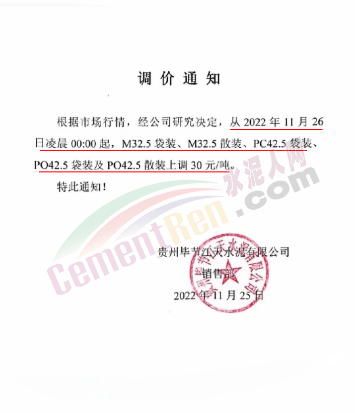 貴州畢節(jié)江天水泥有限公司通知從11月26日凌晨0時(shí)起,各標(biāo)號(hào)水泥上調(diào)30元/噸。