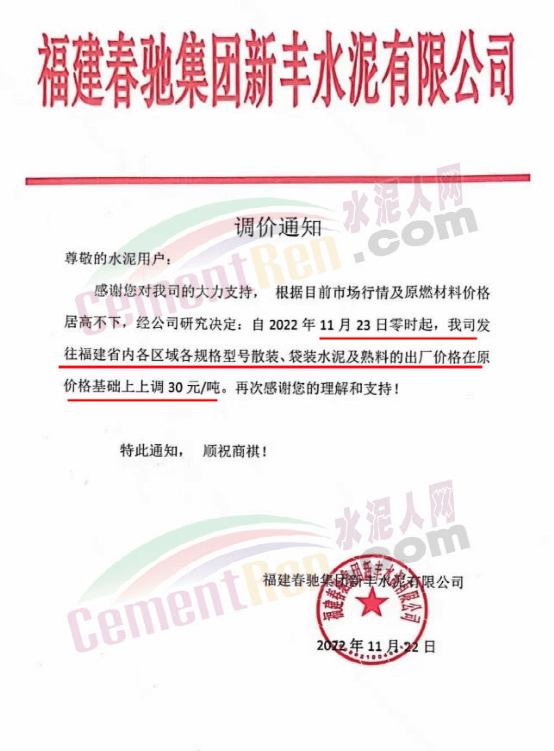 同期,福建春馳集團(tuán)新豐水泥通知根據(jù)目前市場(chǎng)行情 及原燃材料價(jià)格居高不下,經(jīng)公司研究決定,自11月23日0時(shí)起公司發(fā)往福建省各區(qū)域各規(guī)格型號(hào)水泥及熟料出廠價(jià)在原基礎(chǔ)上上調(diào)30元/噸。