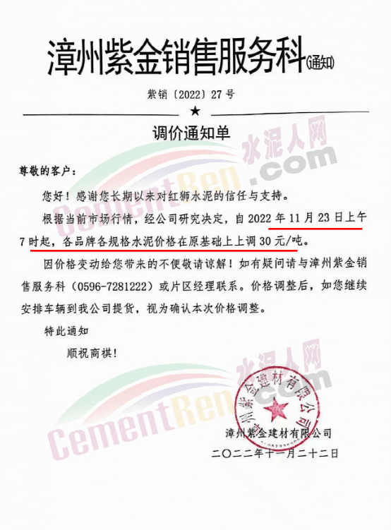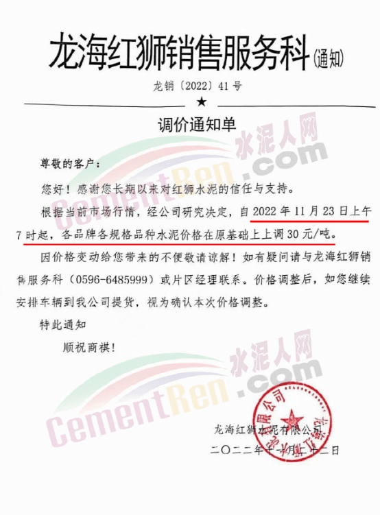 漳州紫金建材、龍海紅獅水泥通知,根據(jù)當(dāng)前市場(chǎng)行情,經(jīng)公司研究決定,自11月23日上午7時(shí)起,各品種各規(guī)格水泥價(jià)格在原基礎(chǔ)上上調(diào)30元/噸。