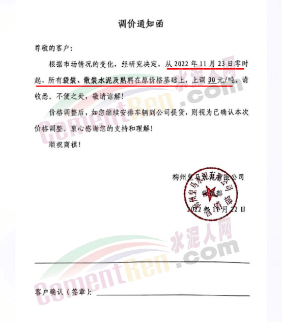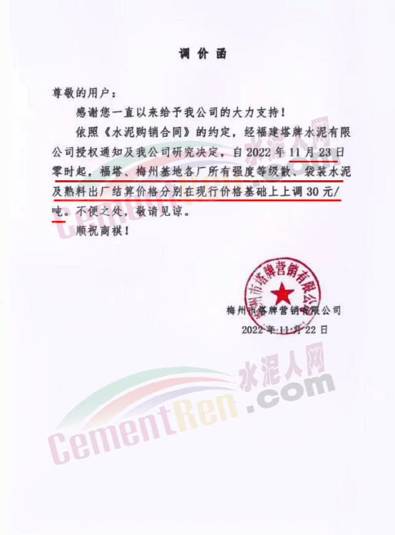 梅州市塔牌營(yíng)銷有限公司通知自11月23日零時(shí)起,福塔、梅州基地各廠所有強(qiáng)度等級(jí)水泥及熟料出廠結(jié)算價(jià)分別在現(xiàn)行價(jià)格基礎(chǔ)上上調(diào)30元/噸。
