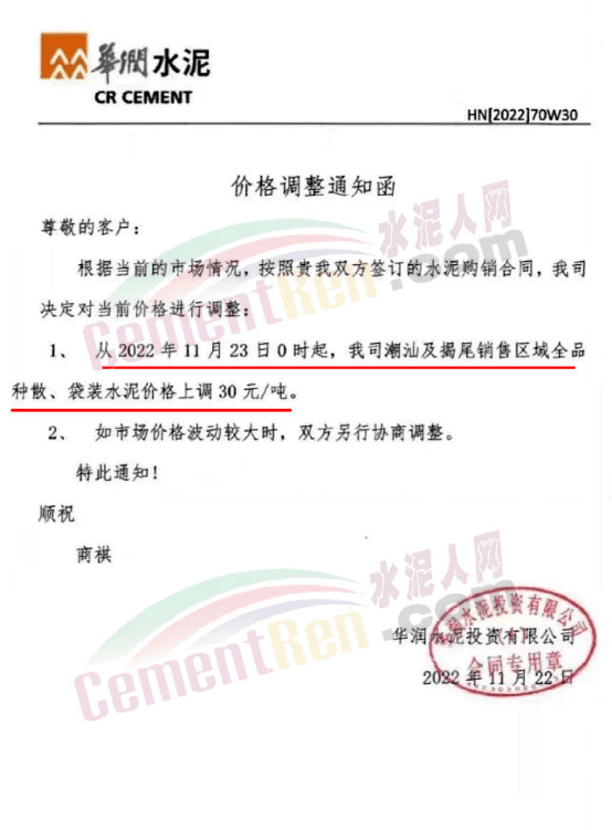 華潤(rùn)水泥投資有限公司通知自11月23日0時(shí)起,公司潮汕及揭尾銷售區(qū)域全品種水泥上調(diào)30元/噸。