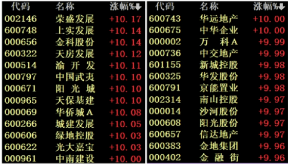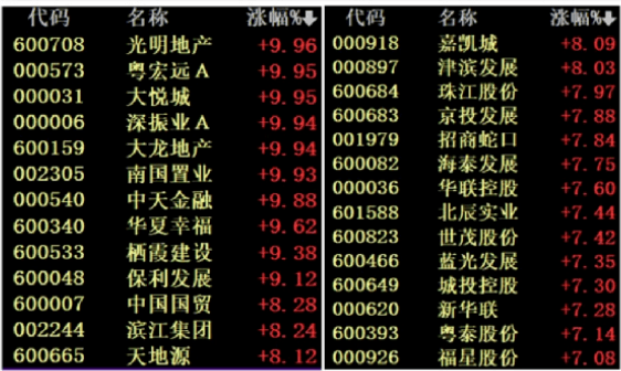 房地產(chǎn)板塊掀起“漲停潮”,中交地產(chǎn)、中國武夷4連板,天房發(fā)展、渝開發(fā)、臥龍地產(chǎn)、空港股份、城建發(fā)展、光大嘉寶、中華企業(yè)、京能置業(yè)、沙河股份、世榮兆業(yè)、陽光股份、信達(dá)地產(chǎn)、光明地產(chǎn)、深振業(yè)A、大龍地產(chǎn)、南國置業(yè)競(jìng)價(jià)漲停。港股方面,多只內(nèi)房股盤中漲超20%。