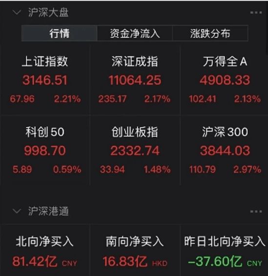 截至上午收盤,上證指數(shù)上漲2.21%,深證成指上漲2.17%,創(chuàng)業(yè)板指上漲1.48%。北向資金凈流入81.42億元。港股也暴漲,恒生科技指數(shù)上午收盤大漲5.45%,重回3600點(diǎn),恒指、國指分別漲3.85%和4.72%。富時(shí)A50期指盤中漲超4%。