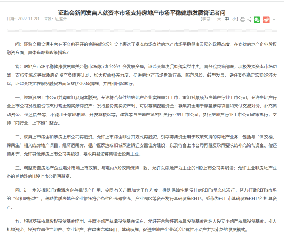 11月28日,證監(jiān)會(huì)新聞發(fā)言人表示,證監(jiān)會(huì)決定在股權(quán)融資方面調(diào)整優(yōu)化5項(xiàng)措施,并自即日起施行。包括恢復(fù)涉房上市公司并購重組及配套融資、恢復(fù)上市房企和涉房上市公司再融資等,這被稱為近期利好房地產(chǎn)行業(yè)的“第三支箭”。