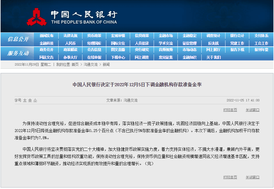 在國務(wù)院常務(wù)會(huì)議“預(yù)告”降準(zhǔn)后,中國人民銀行隨即表示將于2022年12月5日降低金融機(jī)構(gòu)存款準(zhǔn)備金率0.25個(gè)百分點(diǎn)(不含已執(zhí)行5%存款準(zhǔn)備金率的金融機(jī)構(gòu))。本次下調(diào)后,金融機(jī)構(gòu)加權(quán)平均存款準(zhǔn)備金率約為7.8%。中國人民銀行有關(guān)負(fù)責(zé)人介紹稱,此次降準(zhǔn)共計(jì)釋放長(zhǎng)期資金約5000億元,降低金融機(jī)構(gòu)資金成本每年約56億元。