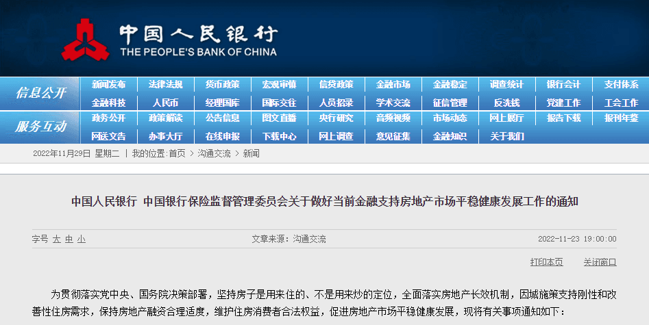 11月23日,《中國人民銀行中國銀行保險(xiǎn)監(jiān)督管理委員會(huì)關(guān)于做好當(dāng)前金融支持房地產(chǎn)市場(chǎng)平穩(wěn)健康發(fā)展工作的通知》正式發(fā)布。