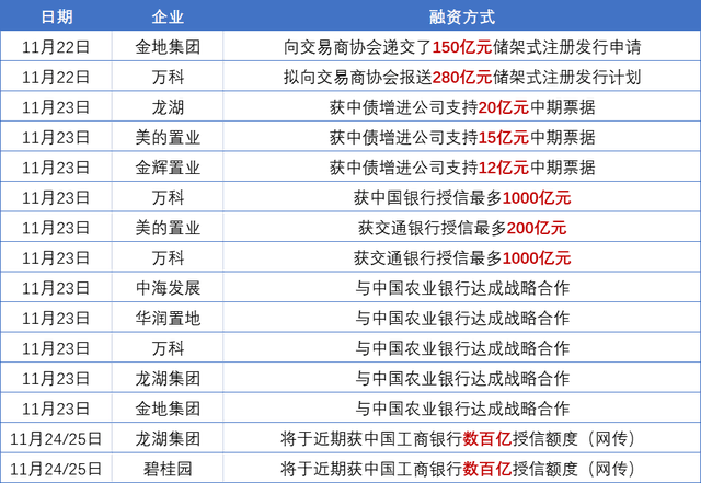 11月23日,中國銀行、農(nóng)業(yè)銀行和交通銀行先后宣布與房企簽署戰(zhàn)略合作協(xié)議,給予房企授信額度。其中,交行率先給予萬科、美的置業(yè)分別1000億、200億授信;中國銀行給萬科1000億授信;中國農(nóng)業(yè)銀行則一口氣與中海發(fā)展、華潤置地、萬科集團(tuán)、龍湖集團(tuán)、金地集團(tuán)五家房企舉行了戰(zhàn)略合作協(xié)議簽約儀式。