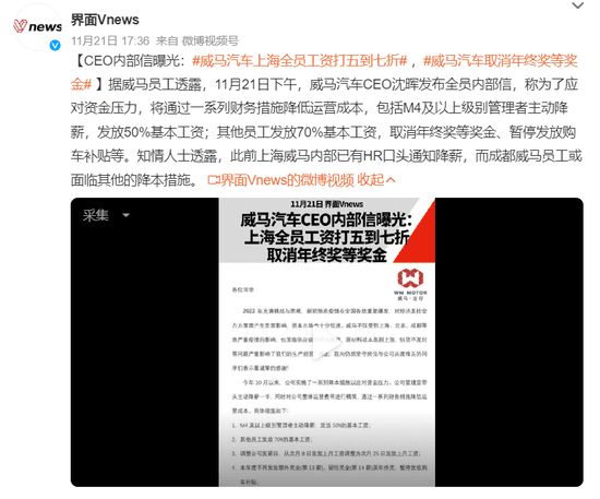 11月21日威馬汽車內部信中提到威馬汽車上海員工工資打五至七折。為了應對資金壓力,公司管理層帶頭主動降薪一半,其他員工發放70%的基本工資,取消年終獎等獎金、暫停發放購車補貼等。同時對公司整體運營費用進行精簡,將通過一系列財務措施降低運營成本。據知情人士透露,成都威馬員工或面臨其他降本措施。