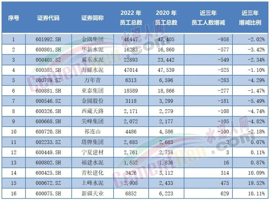 從近三年水泥行業16家上市公司員工增減數據可見,金隅集團、華新水泥、冀東水泥、海螺水泥等10家企業超員100人及以上,其中金隅集團減員958人,華新、冀東、海螺減員500人以上。