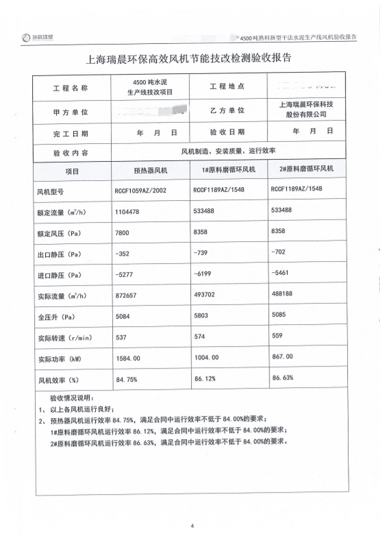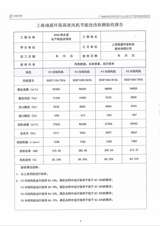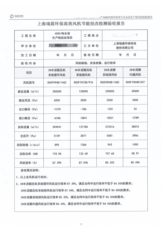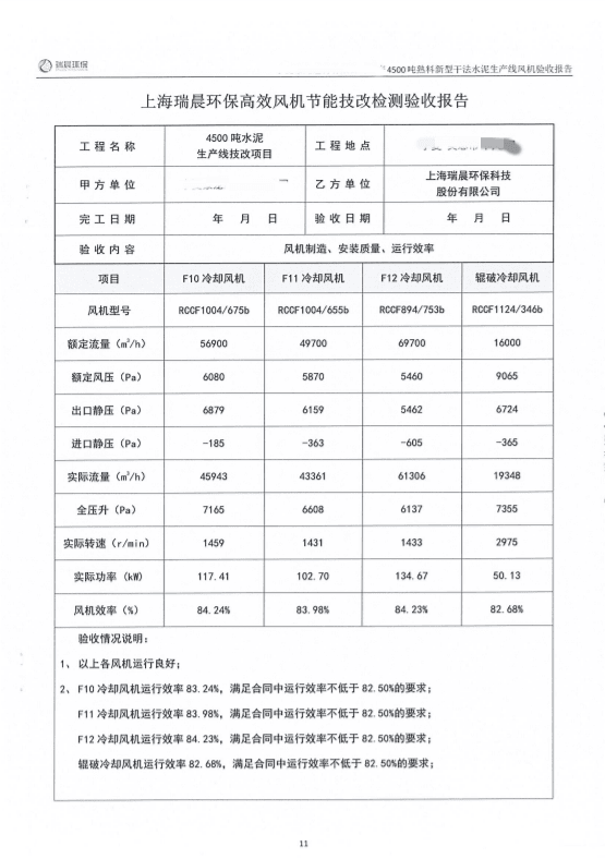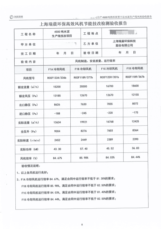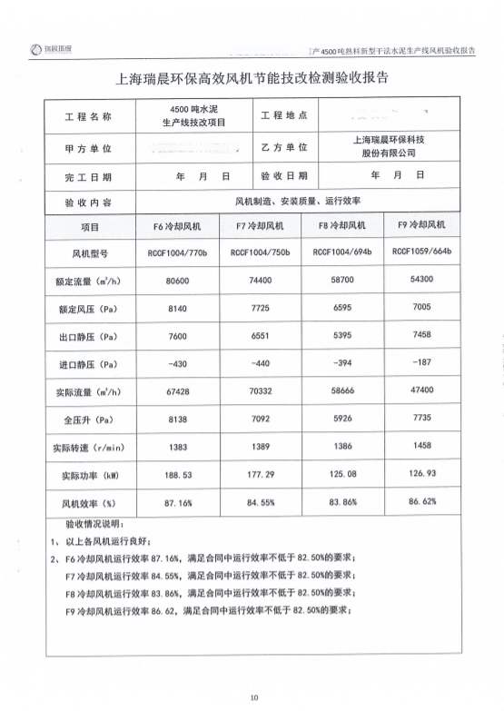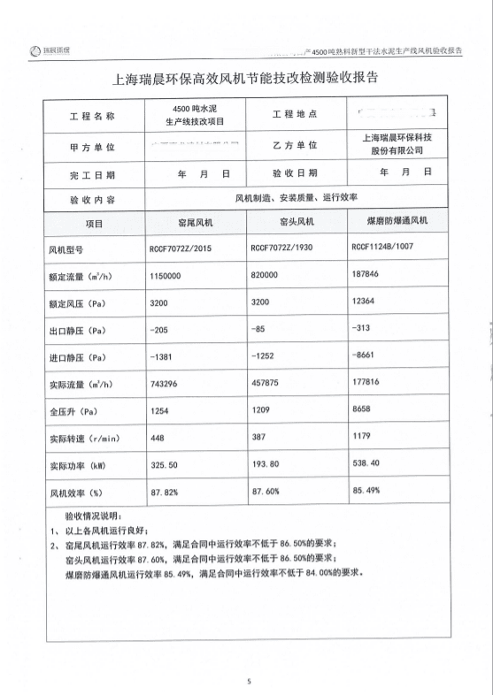 2022年8月,該水泥企業組織雙方共同對全線風機進行了聯合驗收測試。測試結果顯示,風機運行良好,實測效率優于合同約定效率,達到雙方約定的驗收指標,風機單耗低,使用效果好。