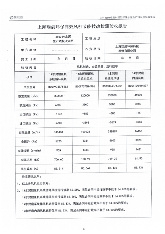 1#水泥輥壓機系統循環風機實測效率為 86.61 % ,1#水泥輥壓機系統排風機實測效率為 85.66 % ,1#水泥磨系統排風機實測效率為 85.13 % ,1#水泥磨內通風機實測效率為 86.73 % ,2#水泥輥壓機系統循環風機實測效率為 87.39 % ,2#水泥輥壓機系統排風機實測效率為 87.04 % ,2#水泥磨系統排風機實測效率為 85.32 % ,2#水泥磨內通風機實測效率為 85.44 % 。
