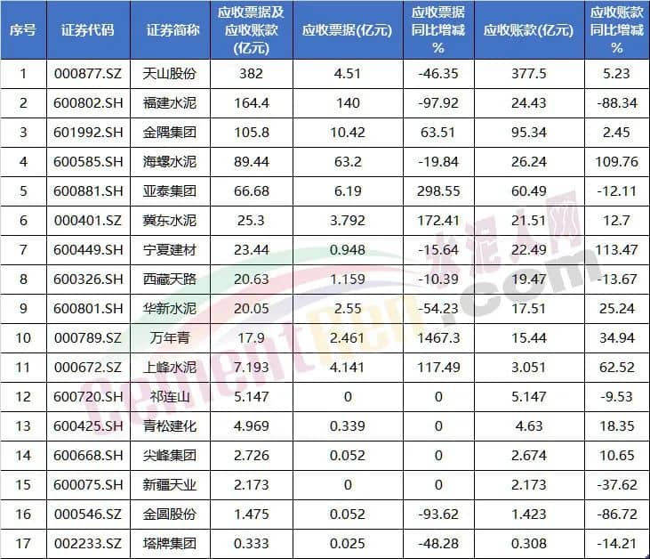 海螺水泥應(yīng)收賬款同比增加超100%,萬(wàn)年青應(yīng)收票據(jù)大增1467.3%