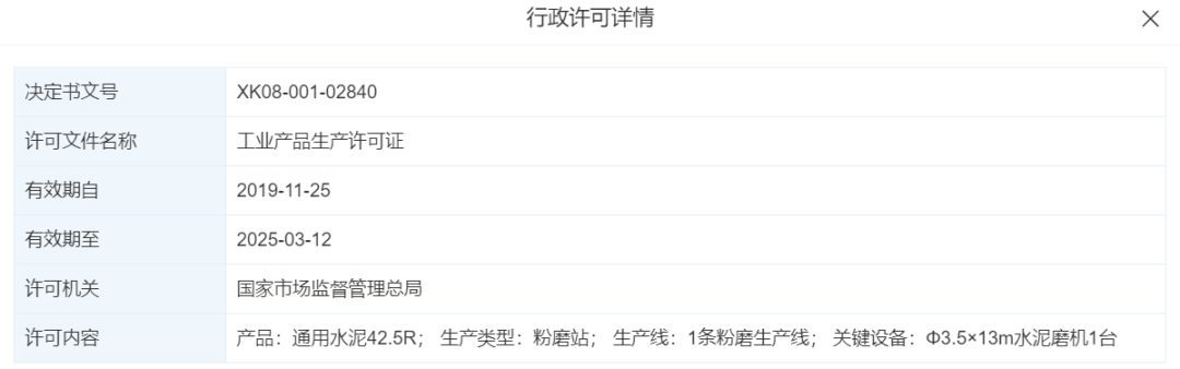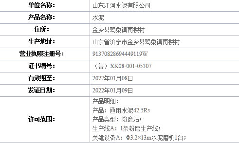 山東江河水泥有限公司生產(chǎn)許可證編號(魯)XK08-001-05307,有效期至2027年1月8日,企業(yè)類型為粉磨站;企業(yè)擁有1條粉磨生產(chǎn)線;關(guān)鍵設備為Φ3.2×13m水泥磨機1臺;企業(yè)“恒誠”商標已注冊。