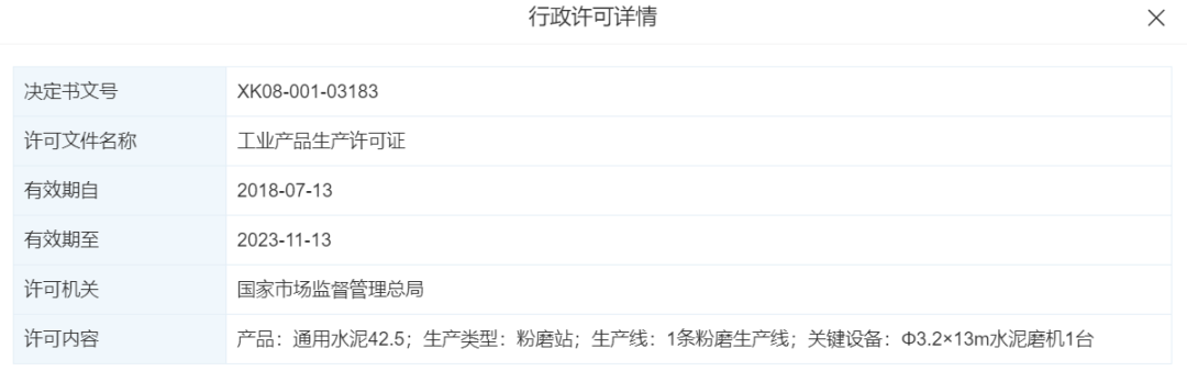 據(jù)查詢,廣西梧州市萬凌水泥有限公司生產(chǎn)許可證編號XK08-001-02840,有效期至2025年3月12日。企業(yè)類型為粉磨站,擁有一條粉磨生產(chǎn)線,關(guān)鍵設備為Φ3.5×13m水泥磨機1臺。