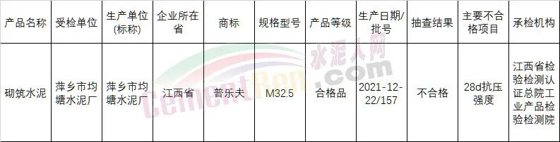江西省市場監(jiān)督管理局對全省水泥產(chǎn)品質(zhì)量進行了監(jiān)督抽查。經(jīng)檢驗,不合格產(chǎn)品1批次,涉及的不合格項目為28天抗壓強度。不合格標稱生產(chǎn)單位為萍鄉(xiāng)市均塘水泥廠普樂夫牌M32.5水泥。