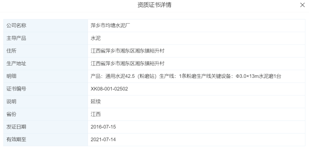 據(jù)查詢,萍鄉(xiāng)市均塘水泥廠生產(chǎn)類型為粉磨站,生產(chǎn)許可證編號為XK08-001-02502。該編號生產(chǎn)許可證有效期截止到2021年7月14日,目前已處于無效狀態(tài)。且“普樂夫”品牌亦非該企業(yè)自有。