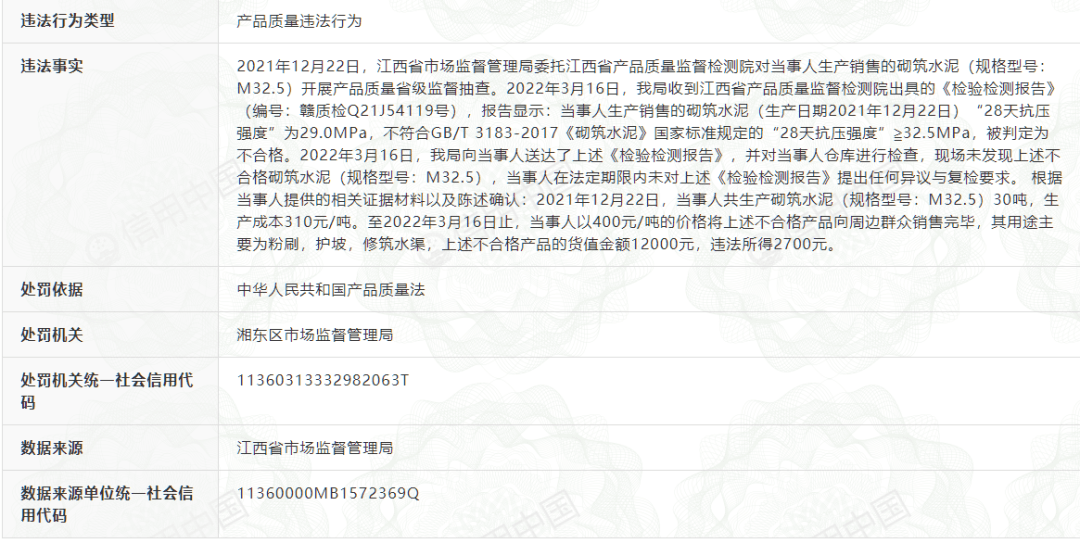 據(jù)查詢, 因生產(chǎn)銷售不合格水泥萍鄉(xiāng)市均塘水泥廠被罰沒人民幣25500元。