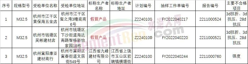 杭州市江干區(qū)黃保海五金店和杭州市錢塘區(qū)吳彬建材店抽檢到兩批次M32.5水泥為假冒產(chǎn)品,主要不合格項目為3d抗折、3d抗壓、28d抗壓;杭州富陽康亞建材商行M32.5水泥,標稱生產(chǎn)者為江西省九峰建材有限公司主要不合格項目為強度。