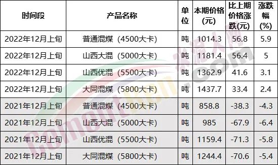 盡管煤價處于持續下跌中已有一個多月,但相比上年同期煤價仍處于高位。日前,國家統計局發布的2022年12月上旬流通領域重要生產資料市場價格變動情況顯示,4500-5800大卡動力煤單價仍在千元以上,同比上年同期仍有155.5~203.5元/噸的差價。