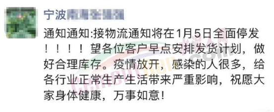 寧波一企業通知稱:接物流通知將在1月5日全面停發。望各位客戶早點安排發貨計劃,做好合理庫存。疫情放開,感染的人很多,給各行業正常生產、生活帶來嚴重影響。