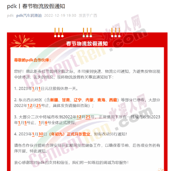 pdk汽車潤滑油春節物流放假通知稱,公司接到快遞、物流公司通知,為避免貨物出現中途停運、丟失的情況,2023年1月1日元旦放假休息一天。