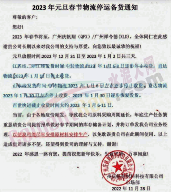 廣州慶帆翔材料科技有限公司通知,江蘇、浙江發貨時間中轉物流2023年1月6~8日逐步停止發貨,直到物流2023年1月11日停止收貨;山東發貨時間,中轉物流2023年1月6日左右逐步停止發貨,直達物流2023年1月10日左右停止收貨,2023年1月30日逐步恢復發貨。百世快運截止收貨時間大約2023年1月6-11日。