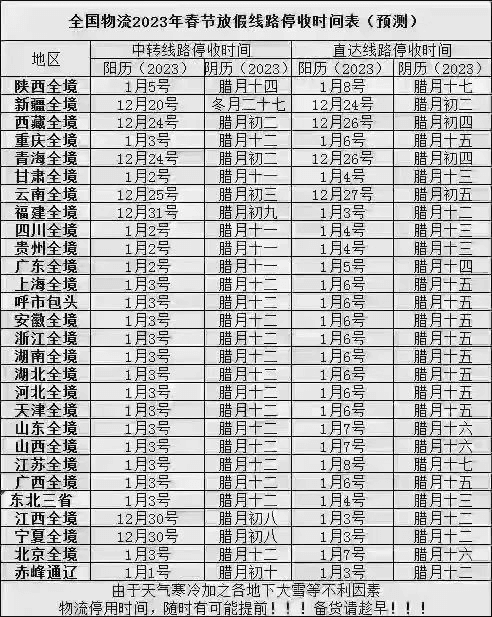 據網傳全國物流2023年春節放假停收時間表預測,中轉線路停收時間最早從12月20日開始,直達線路停收時間最早從12月24日開始。
