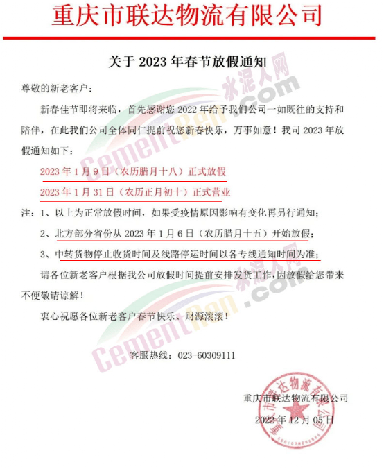 重慶市聯達物流有限公司2023年1月9日(農歷臘月十八)正式放假,2023年1月31日(農歷正月初十)正式營業。如果受疫情原因影響有變化再另行通知;北方部分省份從2023年1月6日(農歷臘月十五)開始放假;中轉貨物停止收貨時間及線路停運時間以各專線通知時間為準。