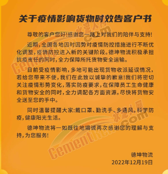 德坤物流關于疫情影響貨物時效告客戶書稱,近期,全國各地因時因勢對疫情防控措施進行不斷優化調整,疫情防控進入新的關鍵階段,疫情影響,多地可能出現貨物收派延誤情況,德坤物流積極承擔抗疫責任的同時,全力保障所托貨物安全運輸。
